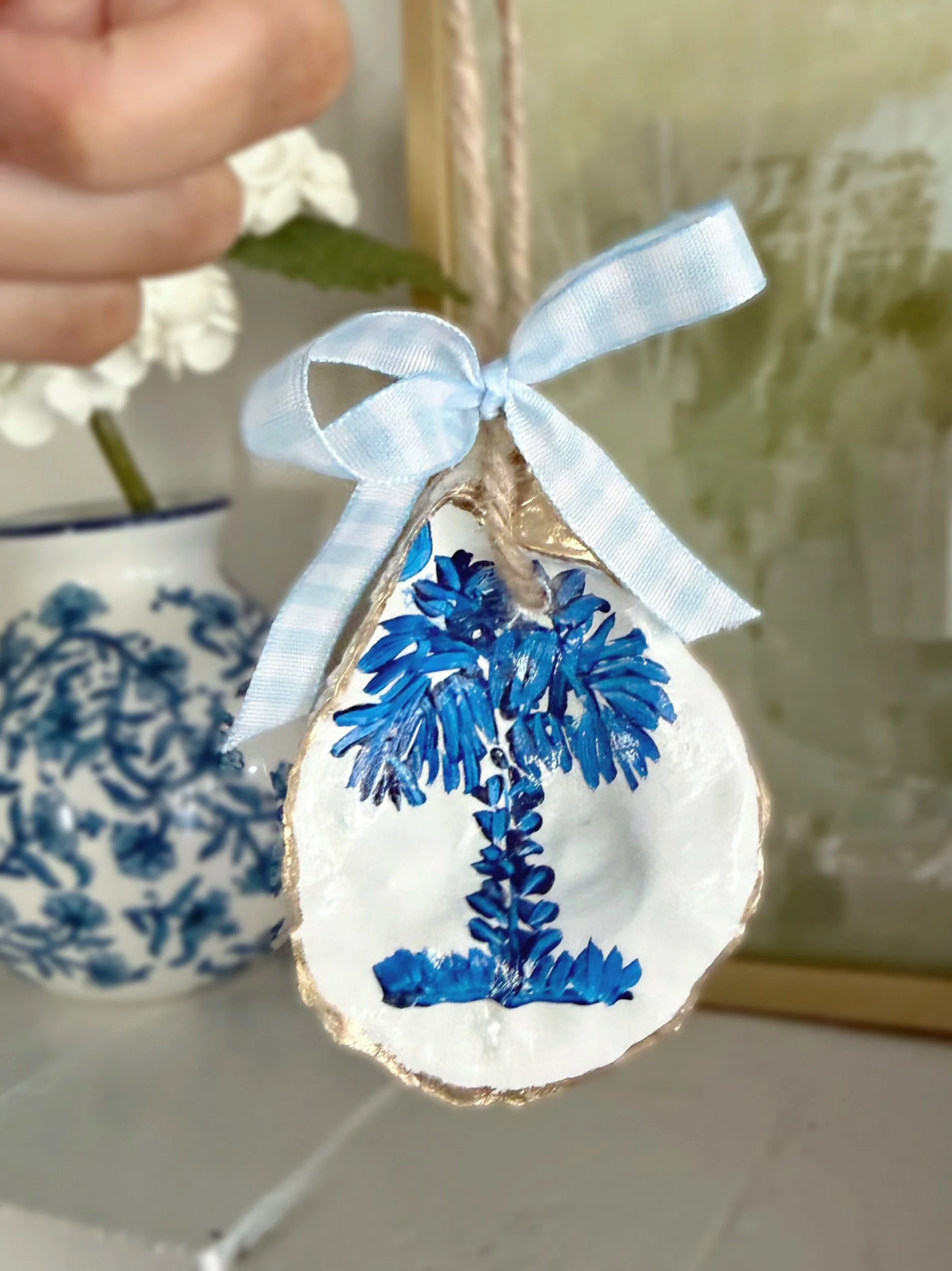Hand-painted palmetto tree inside a gold-trimmed oyster shell, finished with your choice of ribbon. A simple, coastal tribute to South Carolina charm.